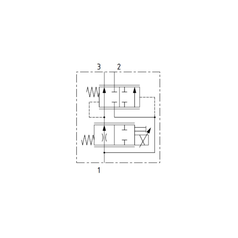 Im stromlosen Zustand ist Anschluss 1 zu Anschluss 3 bis zum Nenn-Durchfluss geöffnet, und der überschüssige Durchfluss gelangt zu Anschluss 2. Durch Anlegen von Spannung an die Spule wird die Spule proportional bewegt, wodurch der Durchfluss durch eine variable Öffnung von Anschluss 1 zu 3 begrenzt wird, während der überschüssige Durchfluss zu Anschluss 2 gelangt. Eine interne Ausgleichsschieberventilspule sorgt dafür, dass der Ausgangsstrom an Anschluss 3 konstant bleibt, unabhängig von Änderungen des Differenzdrucks zwischen Anschluss 1 und 3 oder des Drucks am Bypass-Anschluss 2. Durch Erhöhen des Stroms zur Spule wird der Vorrangausgangsstrom verringert.